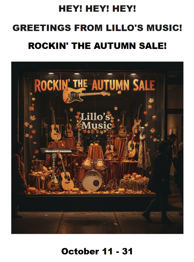 HEY! HEY! HEY! Exciting news! Lillo’s Music is celebrating 62 years in the music business in Old Strathcona! Come by for our special Back to School Sale! Great deals on instruments and music books. The store is open Saturdays from 1 – 4 pm at 10848 – 82nd Avenue and by appointment during the week. SHOP LILLO’S ONLINE and shop our reverb store at Lillo’s Music | Reverb Canada