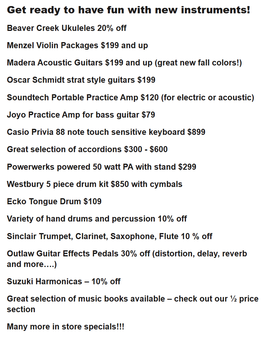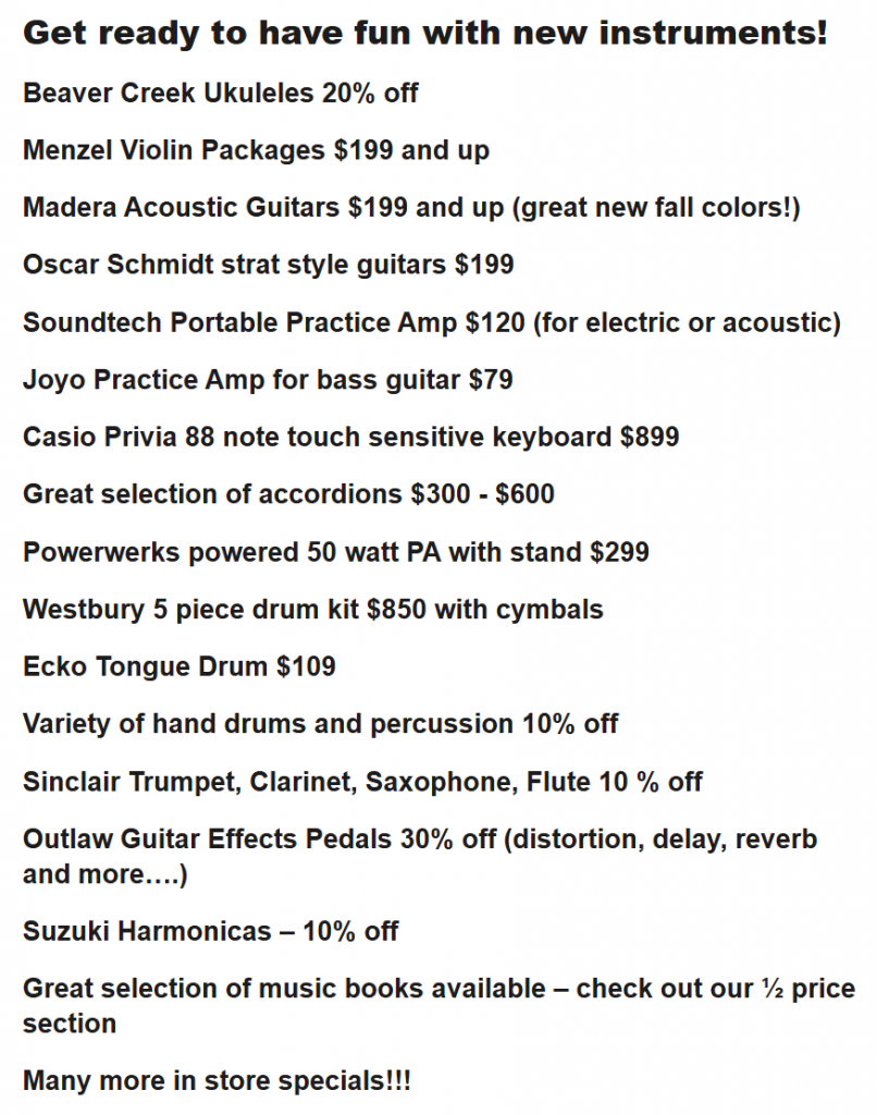 REGISTER NOW FOR MUSIC LESSONS! Private lessons are offered on most instruments and voice. Fill out the Lesson Contact Form or give us a call at (780) 433-0138.